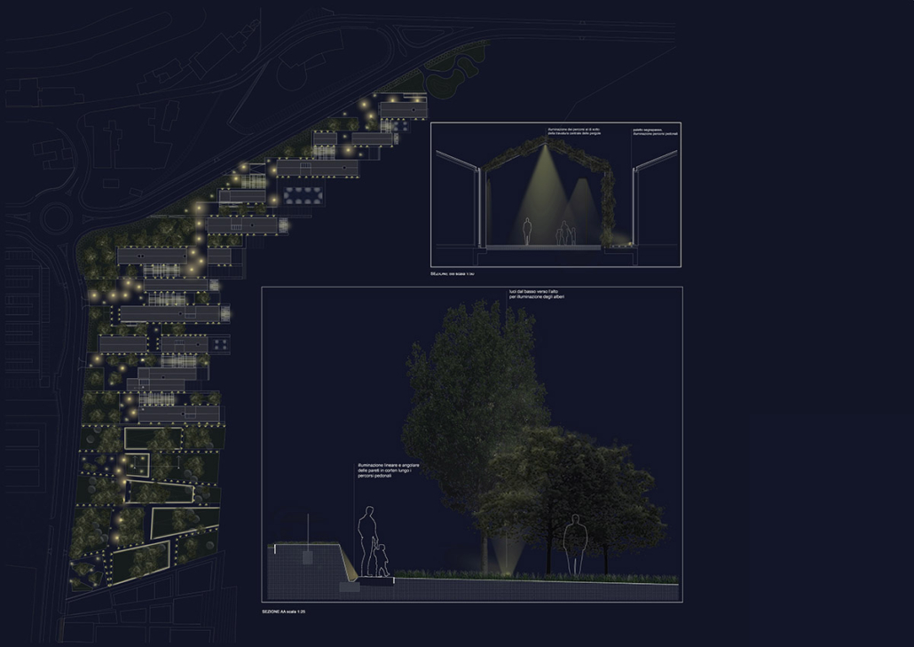 Si sono leggermente incrementati i corpi illuminanti incassati al suolo destinati all’illuminazione scenografica del verde, circoscrivendo la valorizzazione ai soli alberi a fusto grande.