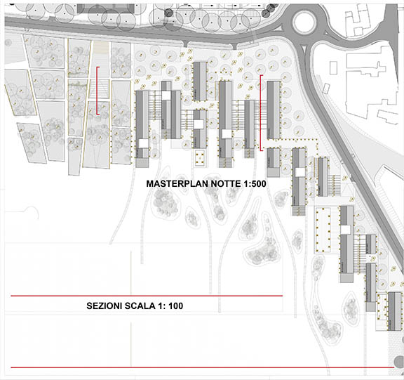 Nelle parti destinate ai pedoni, le aree più retrostanti e più ampie assimilabili a piccole piazzette, si è scelto di alternare l’installazione di pali urbani multispot a quelli con diffusore, permettendo così sia la valorizzazione puntuale delle isole verdi sia l’uniformità dei percorsi pedonali , evitando creazione netta di zone di luce ed ombra.