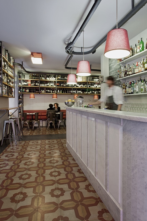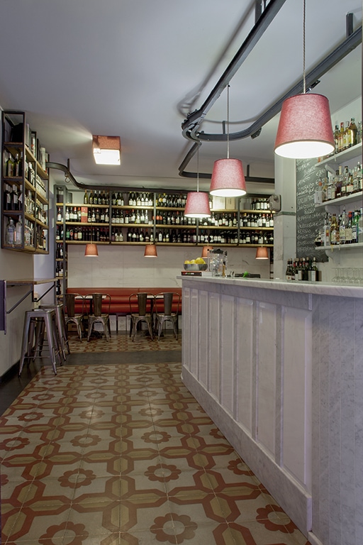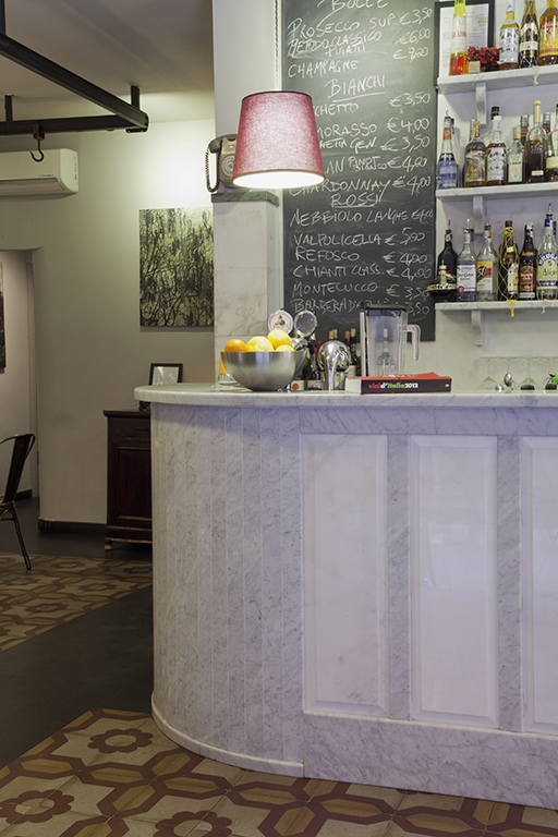 I marmi statuari presenti sulle pareti sono stati riutilizzati per il rivestimento del banco bar e per i tavolini.
