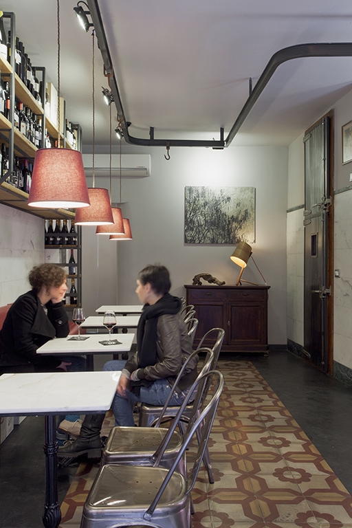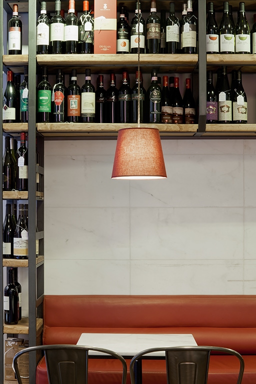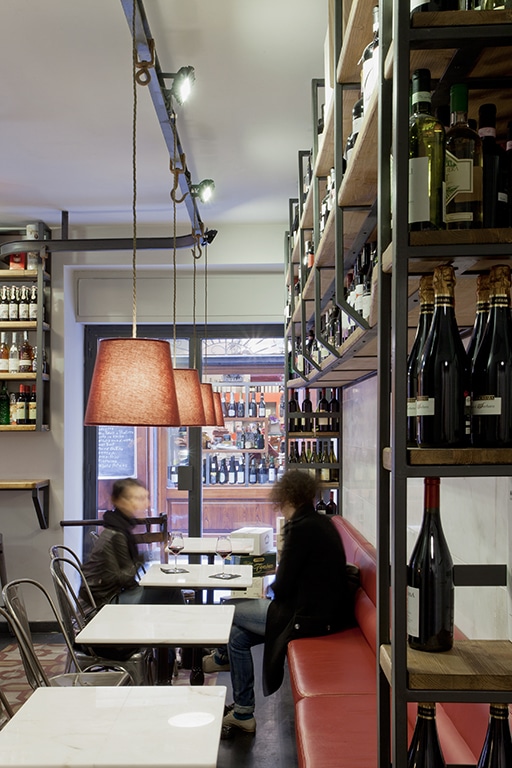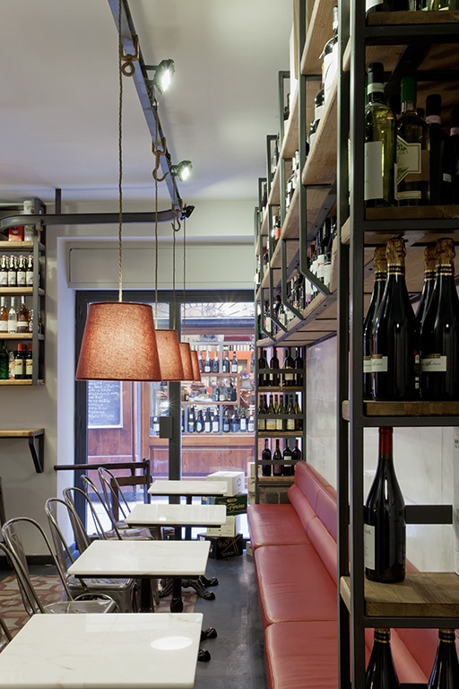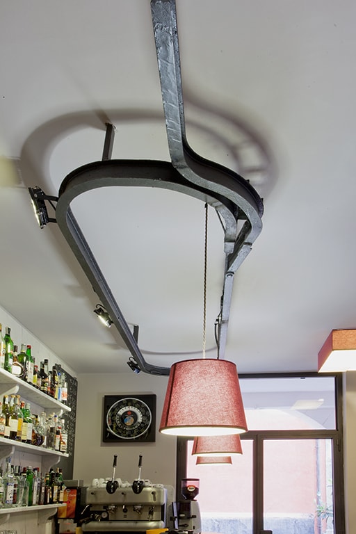Le travi per il trasporto delle carni sono diventate binari “tecnici” per il supporto delle luci (led per l’illuminazione degli scaffali e sospensioni rivestite in stoffa per i tavolini ed il banco bar).